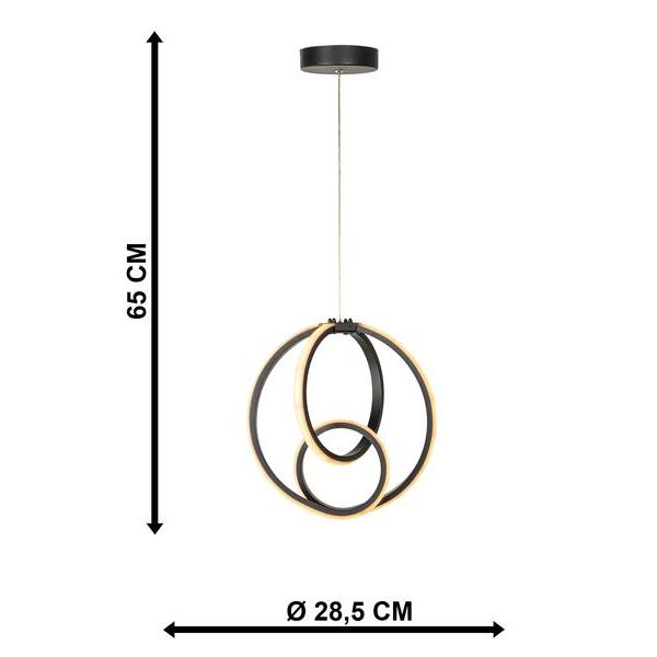 Κρεμαστό φωτιστικό με κύκλους σε μοντέρνο σχεδιασμό, από την Ελληνική εταιρεία Arlight. Διαθέτει φωτισμό LED μέσω ενσωματωμένης πλακέτας, με ισχύ 24watts, ένταση φωτεινότητας στα 1600 lumen και θερμοκρασία φωτισμού στα 4000Κ(ενδιάμεσο λευκό). Οι διαστάσεις του είναι Φ28.5 x H65 cm με σώμα μαύρου χρώματος.