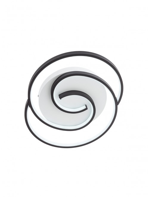 Φωτιστικό οροφής εσωτερικού χώρου εξοπλισμένο με SMD LED, μεταλλική κατασκευή σε λευκό ματ και σπειροειδείς βραχίονες βαμμένους μαύρους ματ, σιλικόνης οπαλίνας. Παρέχεται με τηλεχειριστήριο (περιλαμβάνονται 2 μπαταρίες AAA) με πολλαπλές λειτουργίες: ON/OFF, 3 προγράμματα λειτουργίας, ρύθμιση έντασης φωτός, διακύμανση θερμοκρασίας χρώματος από ζεστό λευκό σε ψυχρό λευκό, χρονοδιακόπτης και λειτουργία νυχτερινού φωτός.
