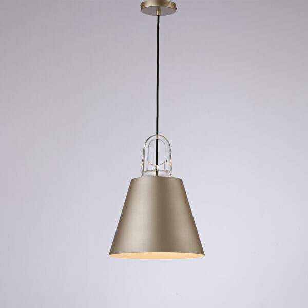 Μονόφωτο κρεμαστό φωτιστικό καμπάνα από την εταιρεία Lucido σε χρυσό χρώμα, με υποδοχή για έναν λαμπτήρα και ντουί E27. Είναι κατασκευασμένο από μέταλλο, ένα υλικό δημοφιλές στα κρεμαστά φωτιστικά οροφής, καθώς πέρα από τη μοντέρνα νότα που προσφέρει, είναι ιδιαίτερα ανθεκτικό στον χρόνο. Καθαρίζεται εύκολα με ένα πανί.